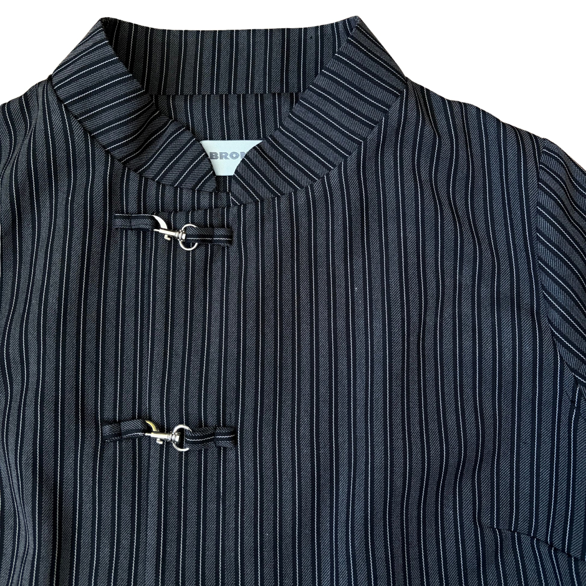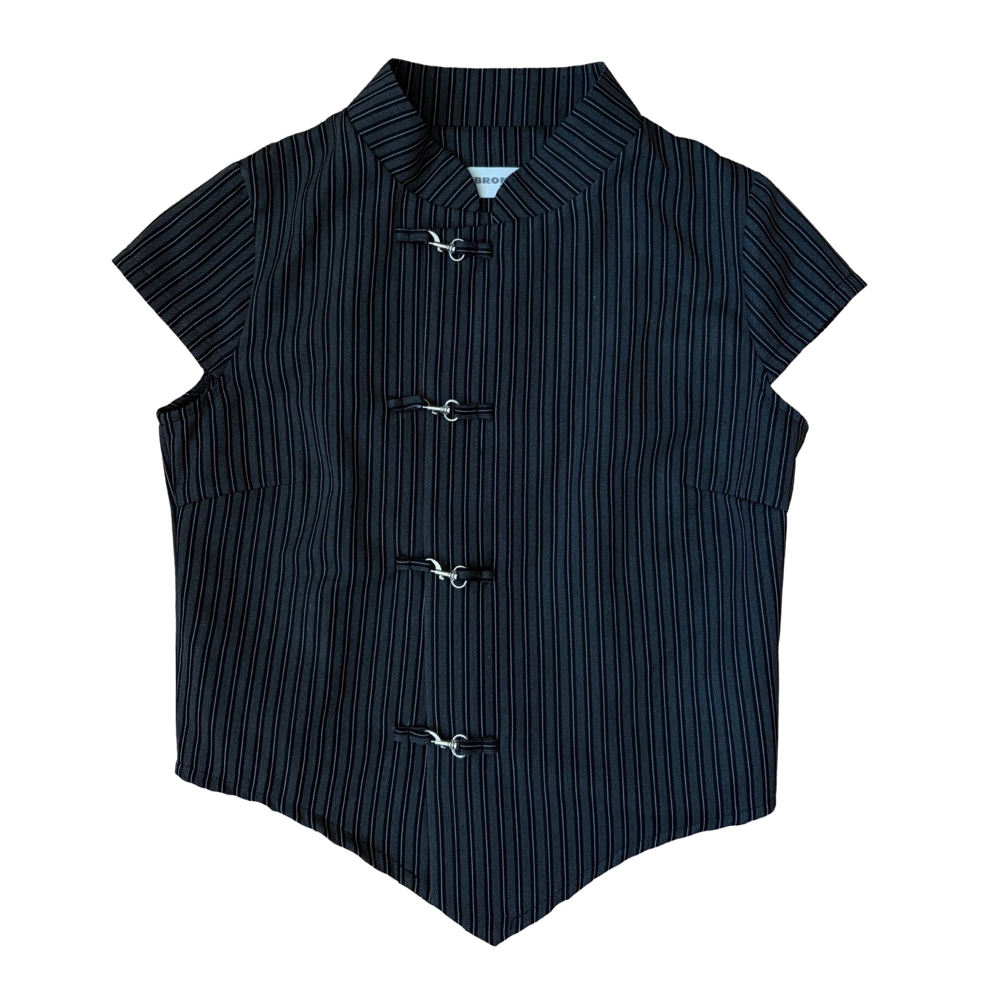 Diseño manga corta con cuello mao y panel delantero con cruce.