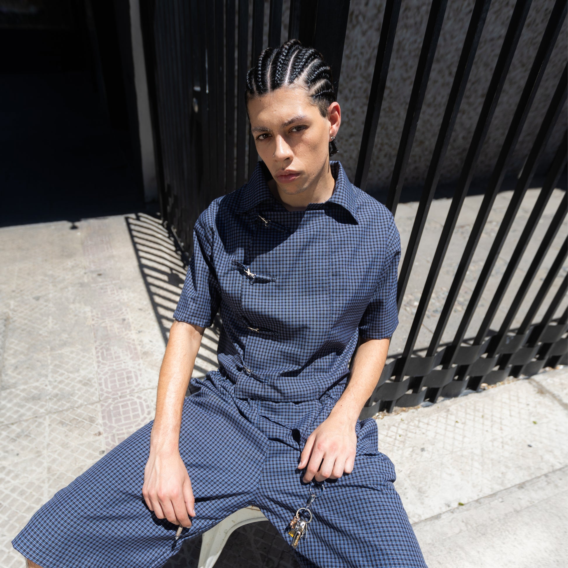 Delantero con sistema de cierre mediante ganchos metálicos sobre presillas textiles, que permite regulación parcial y aporta un carácter técnico–industrial a la prenda.