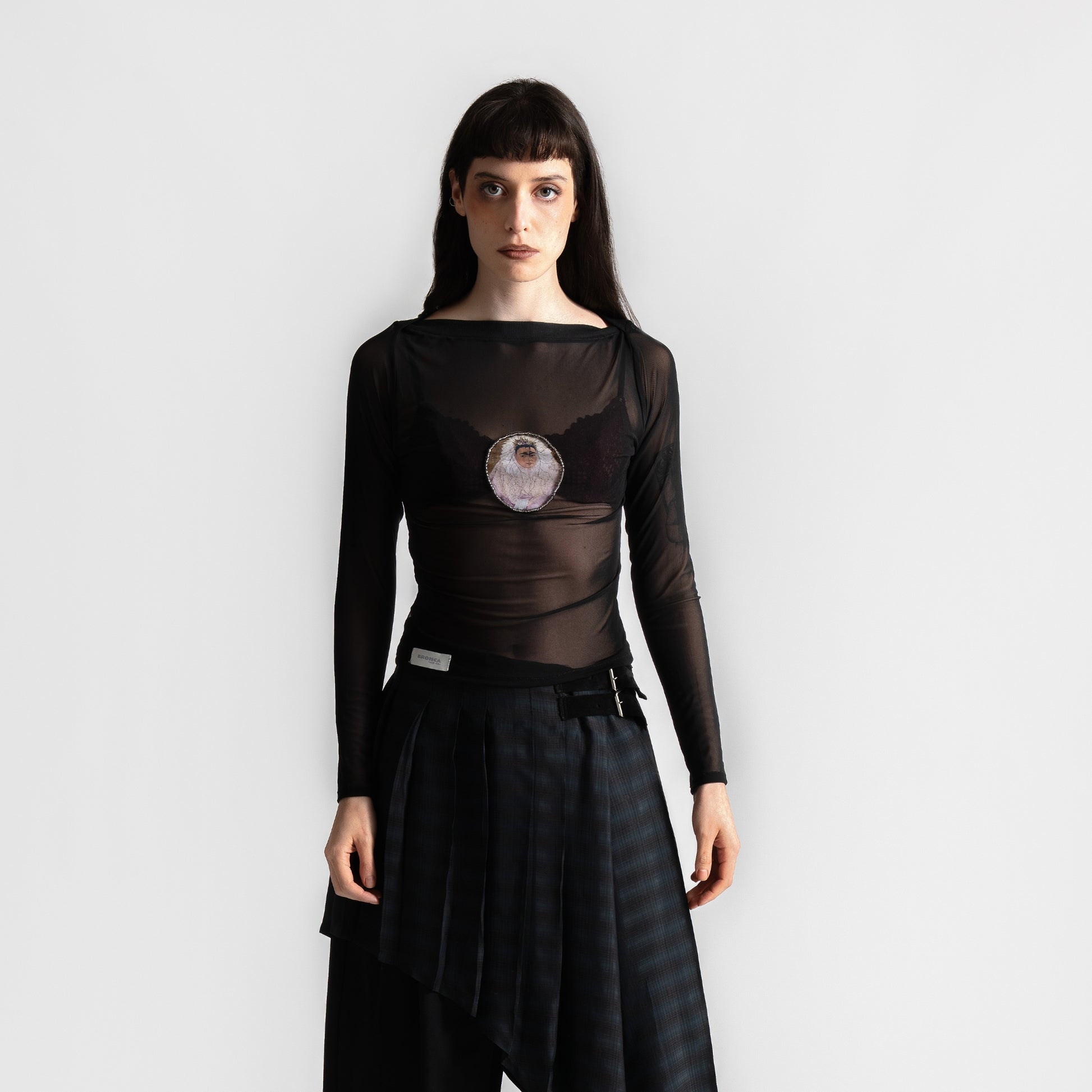 Detalles con mostacillas en centro del pecho, bordado a mano.