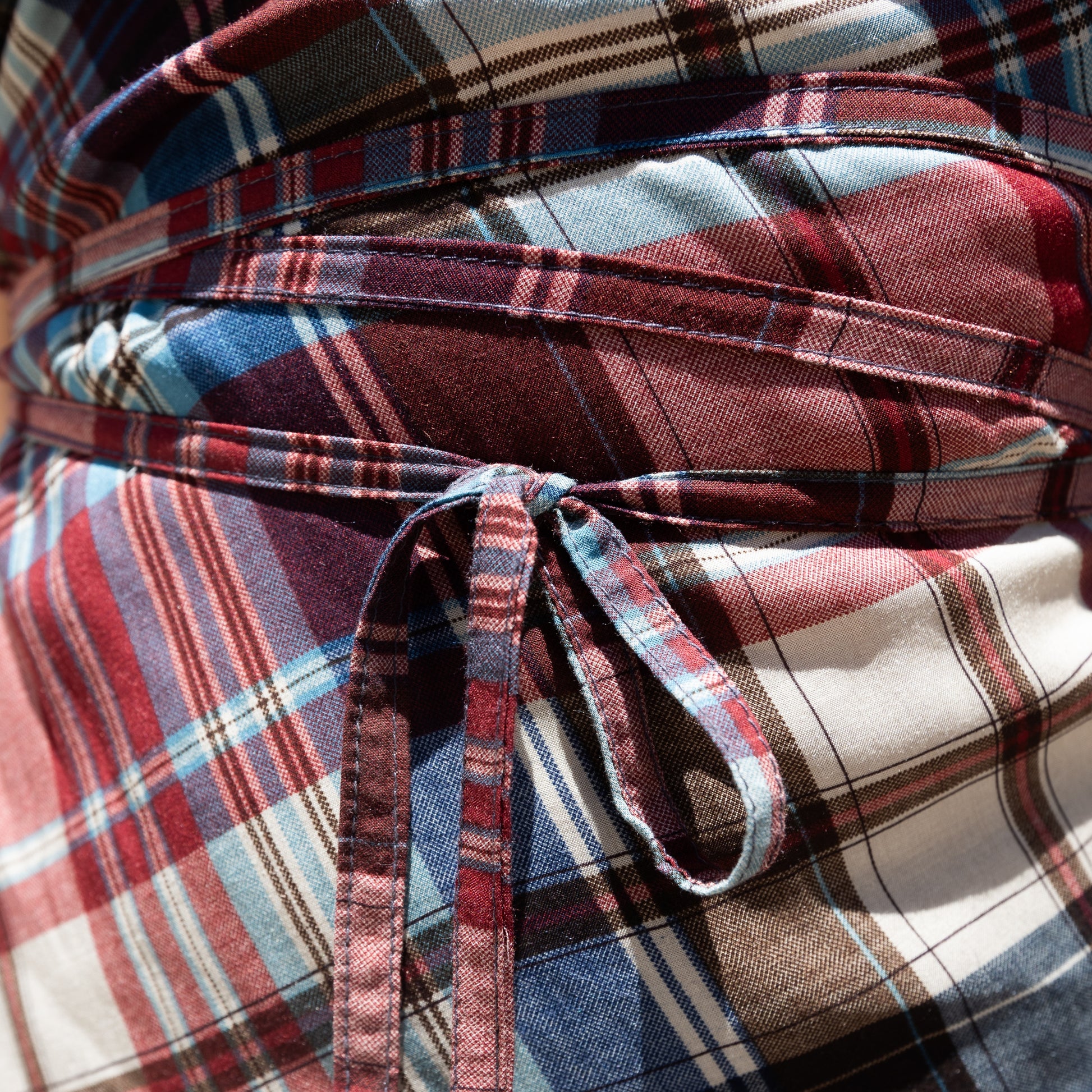Sistema de amarra regulable en cintura con doble tira, que permite ajustar el calce y definir la silueta, aportando funcionalidad estructural a la prenda.