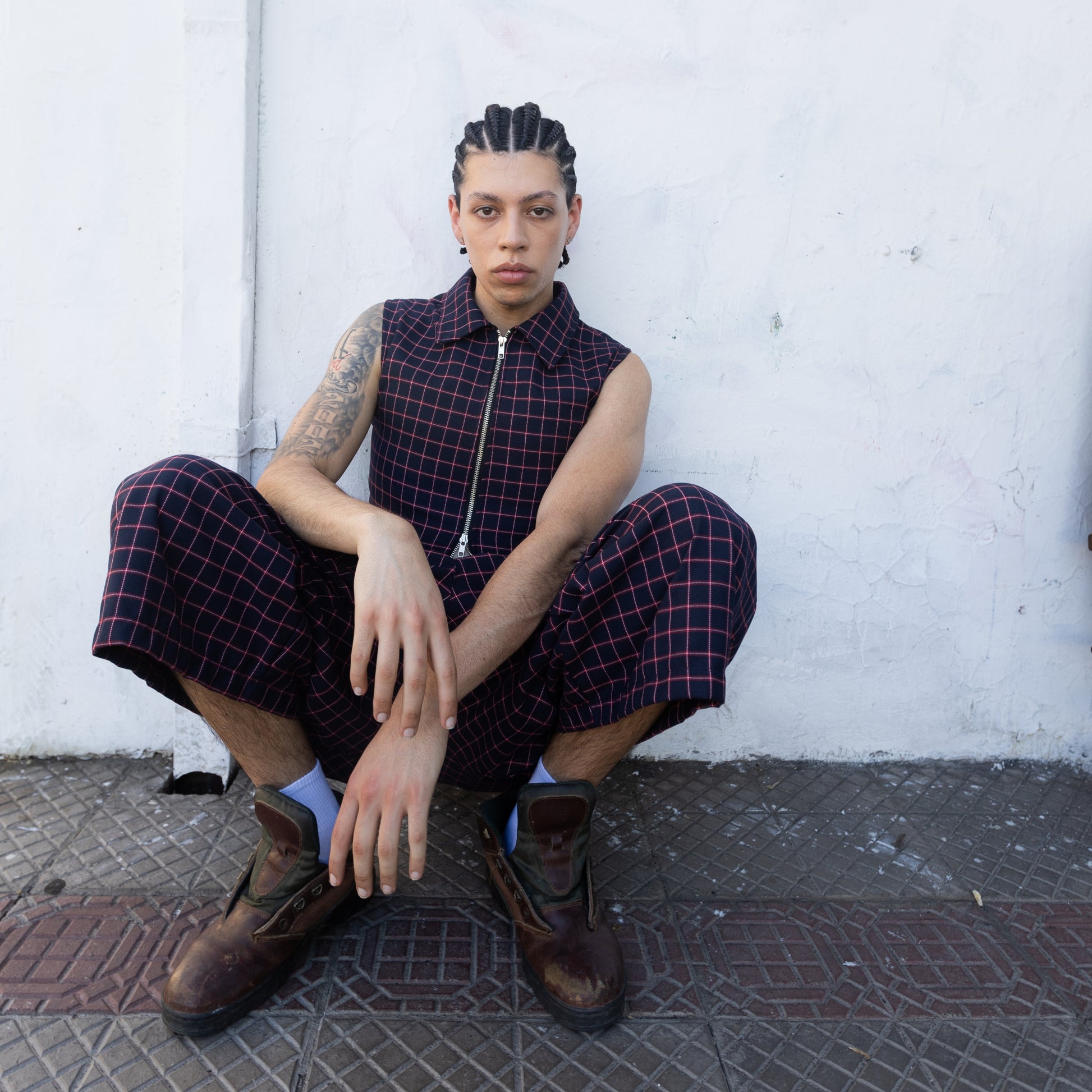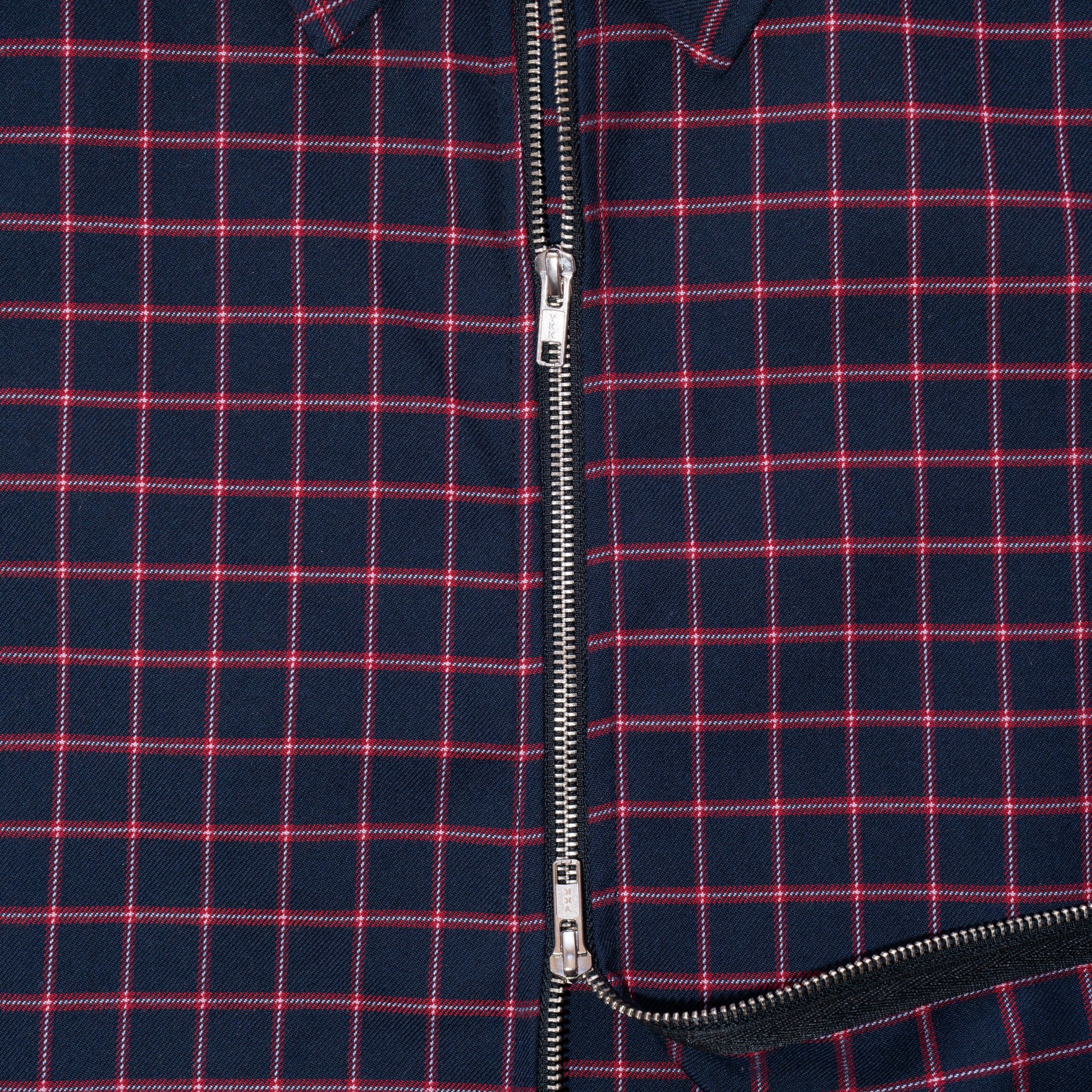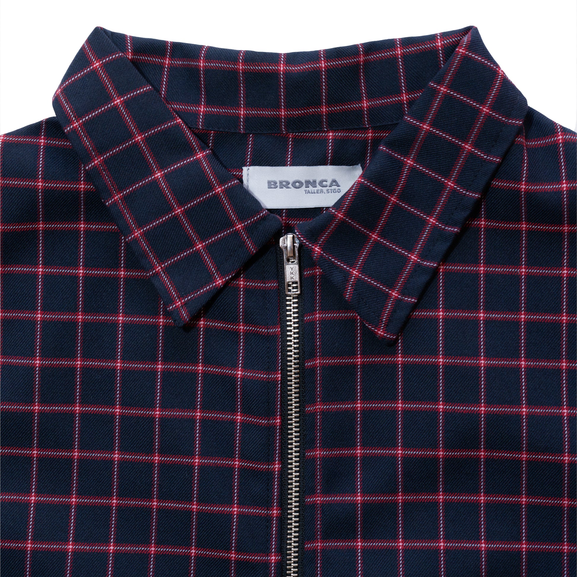 Confeccionado en casimir, estampado a cuadros en base negro con líneas en rojo. El tejido presenta buena estabilidad y caída controlada.
